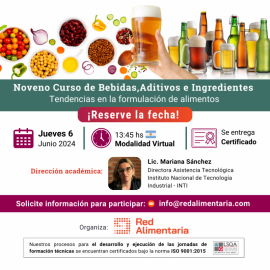 Estar al tanto de las tendencias en la formulaci&oacute;n de alimentos es uno de los desaf&iacute;os que tiene la industria alimentaria para estar a la vanguardia en el desarrollo de nuevos productos. Con el objetivo de acompa&ntilde;ar el avance hacia la creaci&oacute;n de alimentos m&aacute;s saludables y funcionales que responsan a los cambios de h&aacute;bitos del consumidor actual, Red Alimentaria realiza el pr&oacute;ximo 6 de junio el 9no Curso de Bebidas, Aditivos e Ingredientes. Con la coordinaci&oacute;n Acad&eacute;mica de la Lic. Mariana S&aacute;nchez, los temas del programa ser&aacute;n: &ldquo;Aplicaci&oacute;n de fibras en formulaci&oacute;n de productos c&aacute;rnicos&rdquo; &ndash; Disertante: Lic. Mariana S&aacute;nchez, Directora de Asistencia Tecnogica en INTI. &nbsp; &ldquo;Fibra Multifuncional &ndash; 3 en 1&rdquo; &ndash; Disertante: Yael Aizenberg, Gerente global de Ventas y Marketing en GALAM. <p style="text-align: center;"> &nbsp; La jornada, que ser&aacute; en modalidad virtual, comenzar&aacute; a las 13.45 hora Argentina. La actividad es no arancelada pero requiere de inscripci&oacute;n previa en el siguiente: https://cutt.ly/7w5UtGGg &nbsp; M&aacute;s informaci&oacute;n: info@redalimentaria.com &nbsp;
